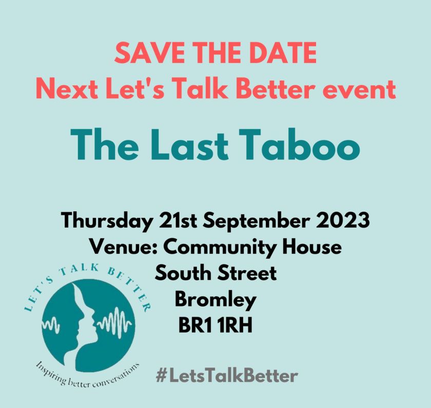 Our next #LetsTalkbetter event is on the 21st of September, themed ‘The Last Taboo’ at Community House in Bromley.
