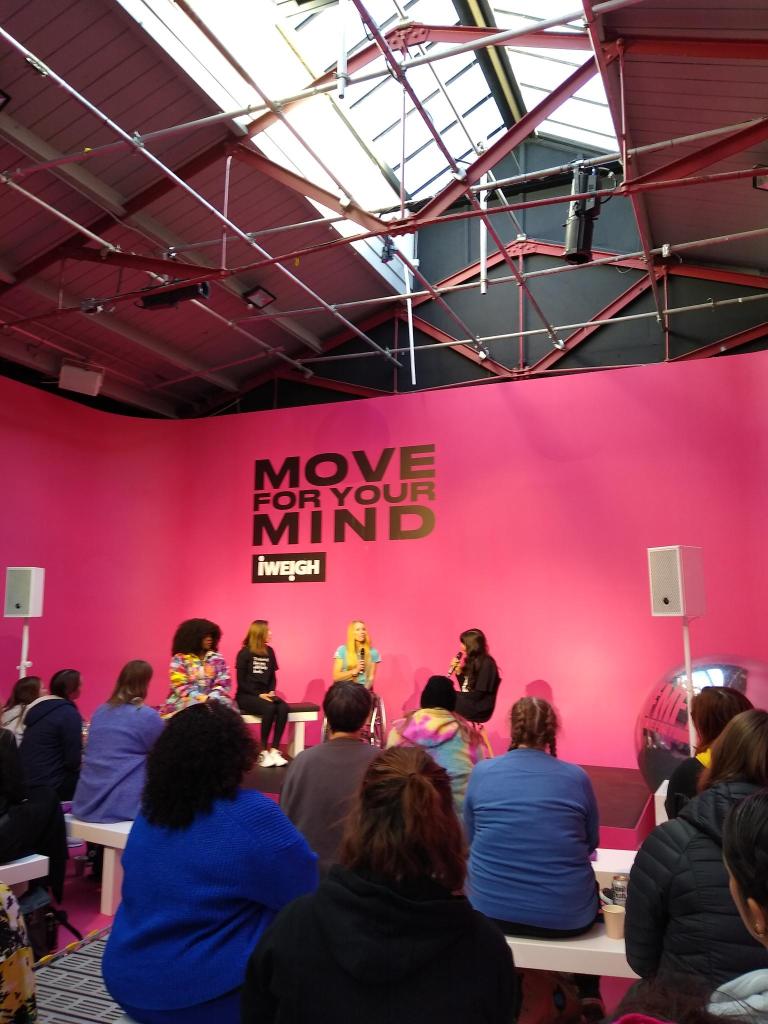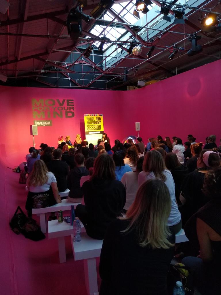 As our digestions coped with cake, we moved more slowly on to a sponsored session, the ASICS panel, “the only ‘inclusive’ brand that said, ‘F**k, yeah’ immediately” to helping, confided Jameela. This panel, ‘Moving away from performance-based exercise’ featured Megan Jayne Crabbe (who I had met and been impressed by before), Tally Rye, and Hayley Jarvis of MIND. Tally’s message was, “If all you think about is diet and exercise, you don’t have much time for anything else… I got out of my selfish bubble.” And, which as a person newly enjoying purposeful walking, I very much get her saying, “Whatever gets you going, gets you going.” Perhaps even better was the slating the panel gave to the ‘no pain, no gain’ philosophy, reinforced in movies, Jameela said, by the message that if “people are having fun, you’re not working hard enough.”