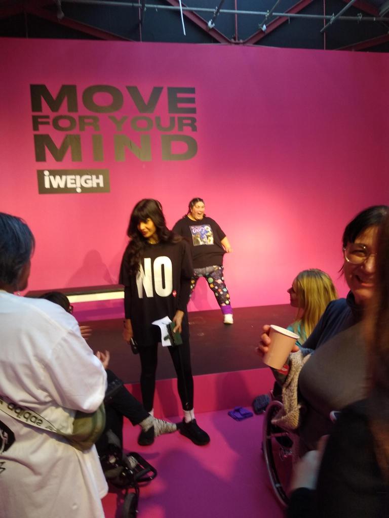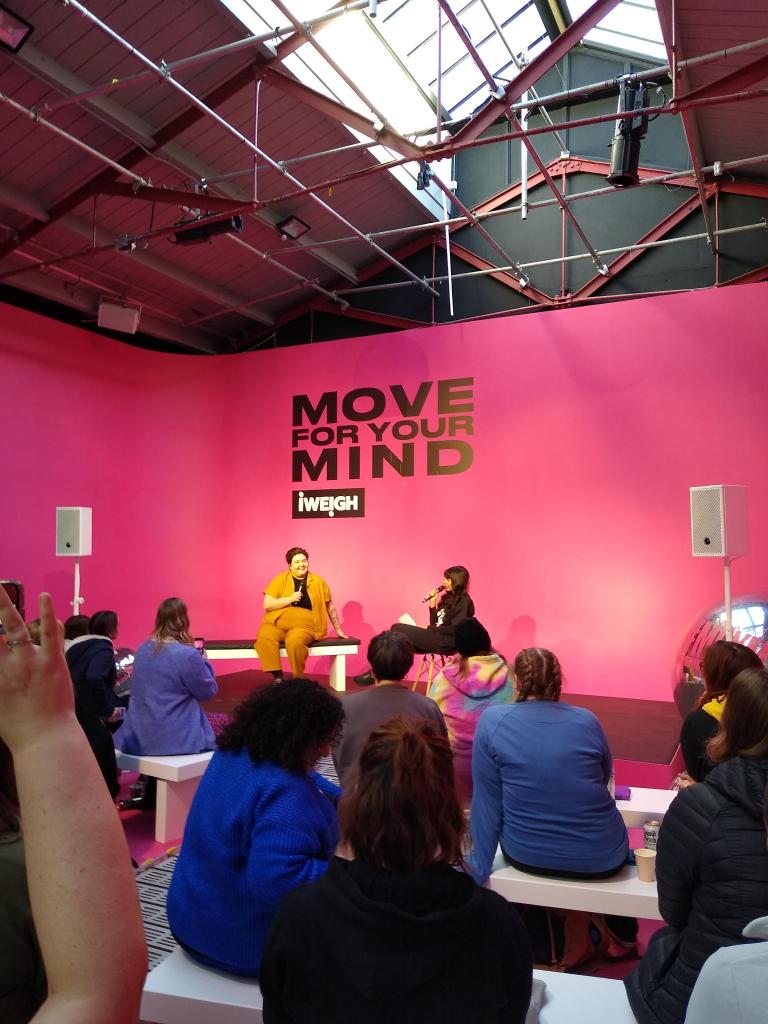 I was an early arrival, third in the queue outside the venue, and grateful for the sun appearing on a very cold day. Inside, I was soon in a hall with a freshly painted pink backdrop, Strictly Come Dancing-style glitterballs, and portable benches (soon to come in useful) with gifts waiting for us (gym sweat towels, canned drinks, and I Weigh badges). Jameela bounced onto the stage (yes, that isn’t just a cliché), saying, “Holy s**t, I am an absolutely petrified public speaker!” More serious words followed, “I can’t believe diet culture has worked its way into every area of our lives, and now exercise.” As Jameela later said, for a long time she regarded exercise as self-punishment for any departure from a diet regime.