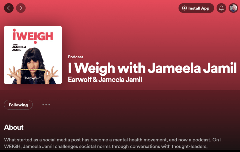 I Weigh podcast with Jameela Jamil – the podcast of an open, disruptive, activist campaign that doesn’t hold with cancel culture, and has swearing! Lots on body image and diet culture. Spotify here. Plus live Move For Your Mind events, here.